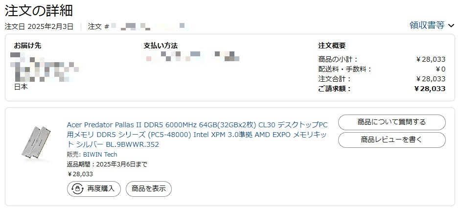 今年2月に誤って28,033円で購入したDDR5-6000 32GBx2のメモリが・・・