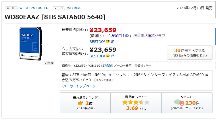 今まで1万6千円前後で販売されていた8TBのハードディスク販売価格が、急に2万~3万円になってしまいました。