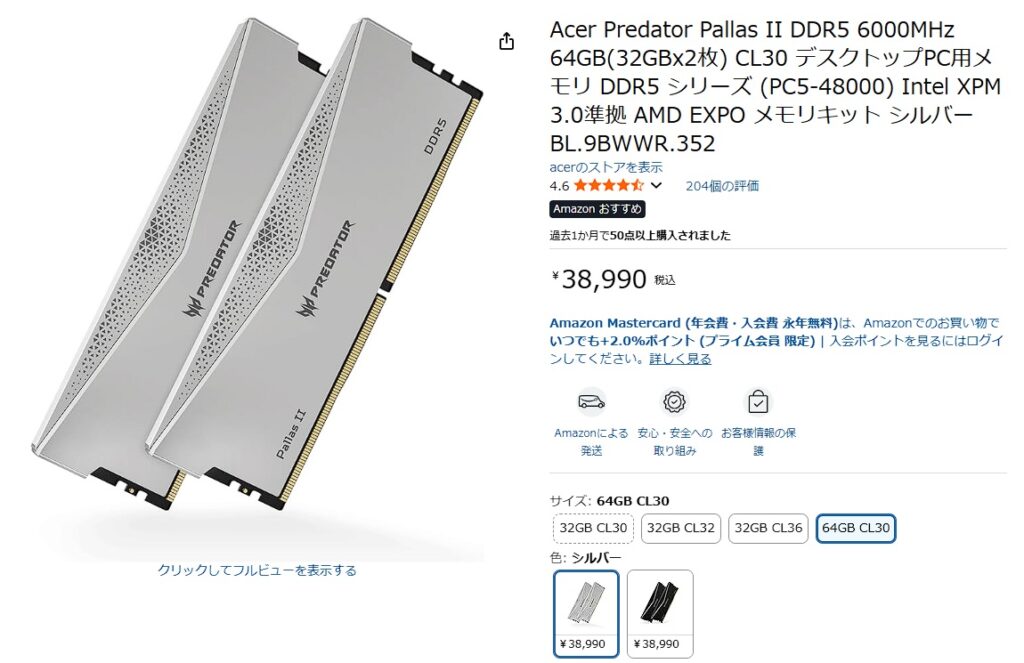 使用しなかった「Acer Predator Pallas II DDR5 6000MHz 64GB(32GBx2枚) CL30」は今押し入れで眠っています。